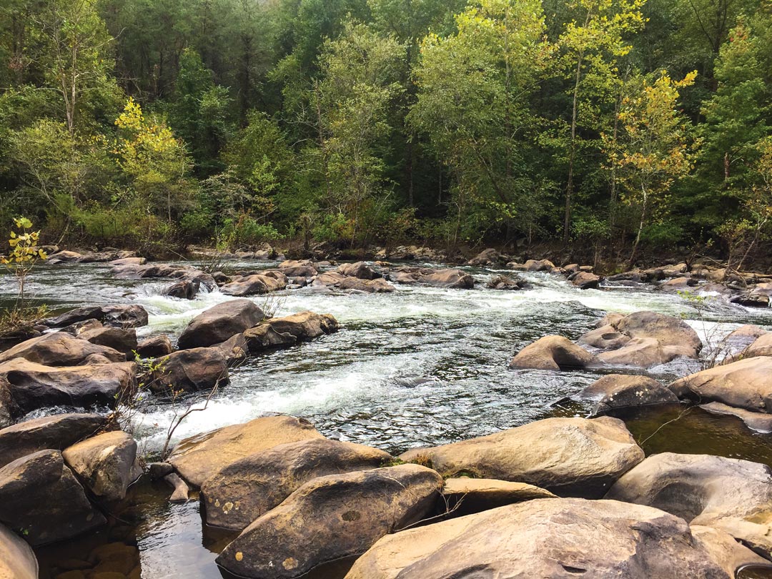Should I continue walking another ten miles or so, as Muir certainly would have, I would emerge on State Highway 68, where not far upstream the river end is held back by Lake Appalachia dam. I can’t make this 16-mile journey in a day, so I return in two weeks to go south from 68, down the Hiwassee to my departure point. From the start, I’m surprised at the lack of use. The river is just as spectacular, but the trail is overgrown, and I realize that I’m going to spend a chunk of the day crawling over and under blowdowns, and at times, simply trying to find the trail. The trail has seen no maintenance work in years. It’s a warm, dry day, and I consider every snarl of downed trees to be a five-star hotel for copperheads. My eyes study patterns in the leaves and grass as I proceed.