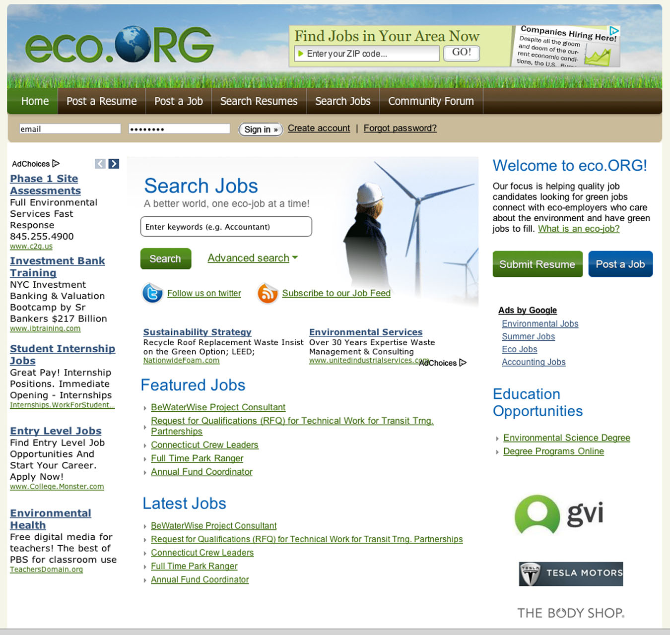 Eco.org prides itself on hosting a wide range of listings from colleges, environmental and other nonprofit groups, media outlets and government agencies. With Google and Bing listing the site first for the search term “eco,” the website generates hundreds of thousands of page visits per month from thousands of green job seekers and employers, and also keeps its audience engaged through social networking.