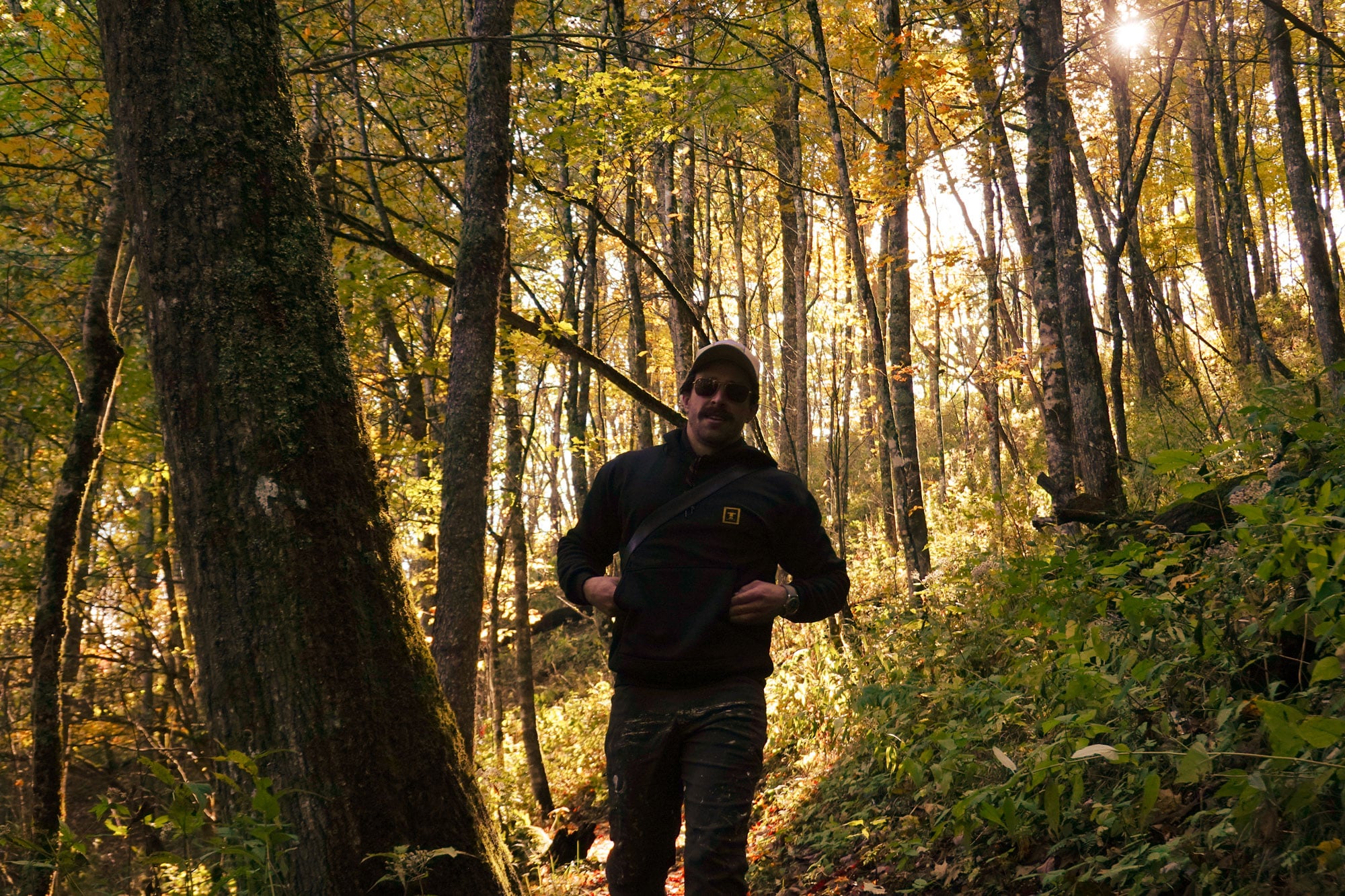 “I promised myself I wouldn’t write a divorce album,” he tells me as we crunch through the thick layer of burnt umber leaves that litter the forest floor.