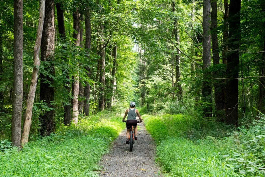 The longest trail in the area is the McDade Recreational Trail, which is popular for hiking, running, and biking. This multiuse gravel path runs for 31 miles along the west side of the Delaware, with occasional river views while passing through dense riparian forest and adjacent farmlands. Since the trail conveniently connects the river access points, it’s also perfect for a bike shuttle.