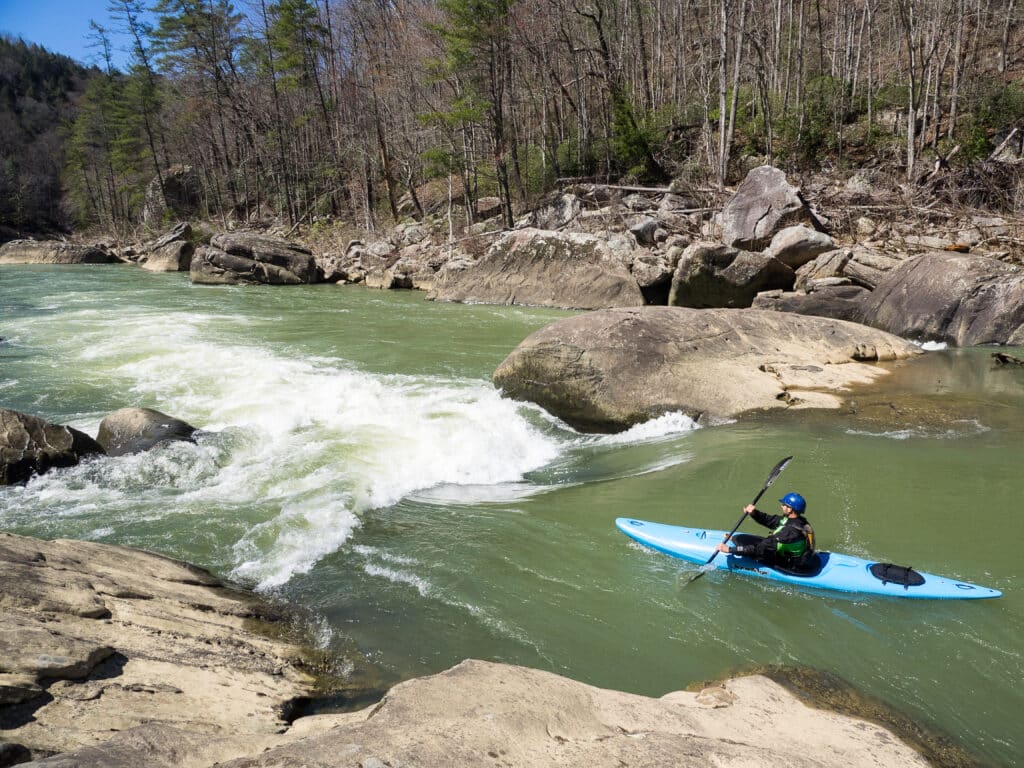 Most rapids on the scenic Big South Fork are created by massive sandstone boulders that long ago tumbled from the cliffs into the wide channel. As a result, there are hazardous undercuts to avoid, where current passes underneath protruding rocks that can trap a swimmer or pin a kayak. For that reason, this upper run is best for paddlers with class III-IV experience.
